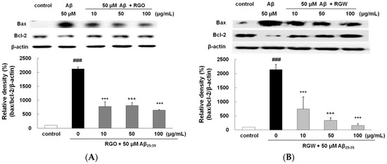It is well established that the ratio of Bax/Bcl-2 plays an important role in mitochondria- mediated apoptosis [26]. The Bax/Bcl-2 ratio significantly elevated in Aβ25–35 group (Figure 5A,B). In comparison with that in the Aβ25–35 group, the expression of Bax decreased in the RGO and RGW groups, whereas the expression of Bcl-2 increased at 10, 50, and 100 μg/mL. The incidence of apoptosis in the RGO- or RGW-treated samples was significantly lower at all the concentrations tested in comparison with that of the Aβ25–35 group.
