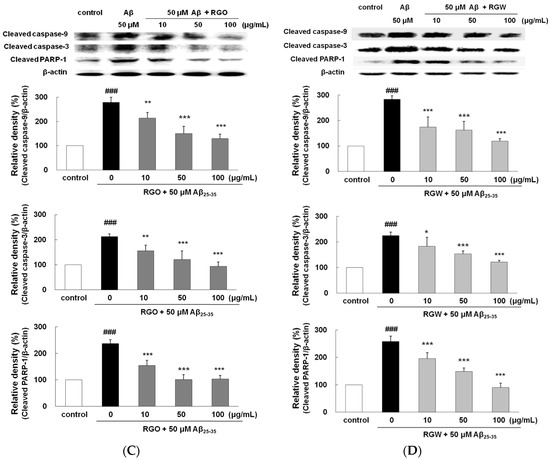 Western blot analysis exhibited that PARP-1 cleavage in Aβ25–35-treated PC12 cells resulted in enhanced caspase-3 activity, which occurred during apoptosis and neurodegeneration. The levels of both caspase-9 and caspase-3 significantly increased with Aβ25–35-stimulaion. Pretreatment with RGO or RGW resulted in the amelioration of Aβ25–35-induced neurotoxicity and dose-dependently suppressed caspase-9 and caspase-3 level in comparison with that observed with Aβ25–35-treatment (Figure 5C,D). Similarly, the levels of PARP-1 increased in Aβ25–35-stimulated PC12 cells, of which was reduced by pretreatment with RGO or RGW. In particular, all concentrations of RGO showed a significant inhibitory effect on caspase-9, caspase-3, and PARP-1.