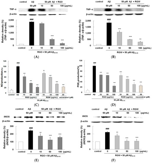 TNF-α is recognized to promote cell survival and death in the central nervous system. Immunohistochemical studies have revealed an increase in TNF-α localized to senile plaques, which suggested its participation in Aβ-induced inflammation [8]. As shown in Figure 6A,B, the release of TNF-α was significantly higher in Aβ25–35-treated PC12 cells than in the untreated control (p < 0.001). The TNF-α levels were dose-dependently suppressed by pretreatment with RGO and RGW. In particular, when the cells were preincubated with 100 μg/mL RGO, TNF-α production was markedly suppressed to a similar value as that of the unstimulated control (p < 0.001).