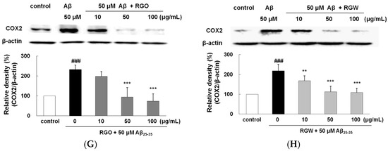 As shown in Figure 1A, RGO and RGW did not affect cell viability even at the highest concentration up to 100 μg/mL. Moreover, single oral administration RGO (5 g/kg) to Sprague–Dawley rats induced no changes in cell viability [19]. Both results suggested that RGO and RGW could be safely used in further experiments as they were not cytotoxic. When stimulated with 50 μM Aβ25–35, cell viability markedly decreased to 59.57 ± 4.01% of that of the control group (Figure 1B), but the Aβ25–35-generated cytotoxicity was attenuated by treatment with RGO, as well as RGW. These results showed that both RGO and RGW had neuroprotective components.