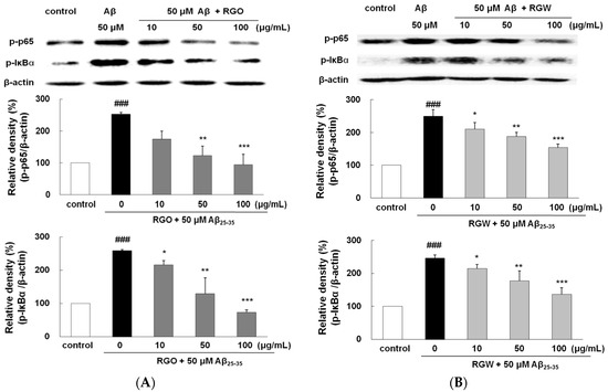 Aβ triggers the activation of NF-κB, leading to gene transcription responsible for the inflammatory responses accompanying Aβ neurotoxicity [30]. Aβ25–35 increased p65 level significantly by 252.2 ± 5.8%. However, both RGO effectively blocked the phosphorylation of p65 (Figure 7A,B). In particular, RGO at 100 μg/mL resulted in almost complete inhibition of p65 phosphorylation (p < 0.01). Aβ25–35-triggered IκB-α phosphorylation was impeded by RGO pretreatment. Unexpectedly, RGO potently showed much better suppression in Aβ25–35-triggered IκB-α phosphorylation than RGW, which clearly implied that RGO exerted its anti-inflammatory action via the suppression of both p65 and IκB-α activation.