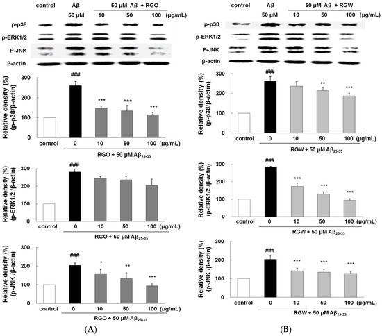 To examine whether the suppression of NF-κB by RGO or RGW was provoked via MAPK pathway, Aβ25–35-stimulated phosphorylation of MAPKs was analyzed. After Aβ25–35 treatment, the phosphorylation levels of p38, ERK1/2, and JNK significantly elevated (Figure 8A,B). Although RGO did not affect ERK1/2, it notably attenuated the Aβ25–35-stimulated p38 and JNK phosphorylation; in particular, p38 was downregulated to 123.8 ± 6.8%, 123.4 ± 14.4%, and 107.7 ± 17.6% at 10, 50, and 100 μg/mL, respectively. In contrast, the suppression of JNK and p38 by RGW was relatively weak compared with that of RGO; however, RGW pretreatment strongly attenuated the Aβ25–35-induced phosphorylation of ERK1/2 in a dose-dependent manner. Overall, our results demonstrated that the inhibitory mechanisms of NF-κB activation by RGO and RGW were different.