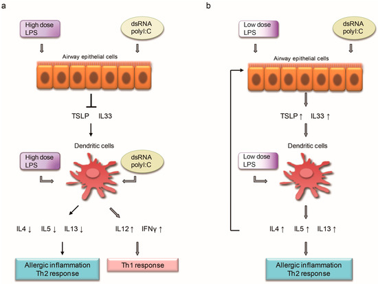 According to the hygiene hypothesis, the increased incidence of allergic disorders in developed countries is explained by the decrease in infections [1,2]. Several studies have shown that exposure to more LPS (lipopolysaccharide and endotoxin), a major component of the outer membrane of gram-negative bacteria, in early childhood protects against the later development of allergic disorders [3,4,5]. However, these studies were done in rural areas in Europe. An urban study examined a birth cohort in the inner-city environment, and declared that exposure to specific Firmicutes and Bacteriodetes in house dust during children’s first year of life was associated with decreased atopy and atopic wheeze. Exposure to high levels of both allergens and this subset of bacteria in infancy was also inversely related to the incidence of atopy or wheeze [6]. Another study focusing on the common cold also concluded that more runny nose episodes in infancy protected against later atopy [7]. Some questions, however, remained to be answered, especially the mechanisms of protection, the nature of protective infections, and why, after sensitization, LPS seems to exacerbate the conditions, rather than protect the organisms [8]. The mechanism by which LPS might downregulate allergic airway inflammation and subsequently suppress airway hyperreactivity was not clear, but two recently published studies proposed a plausible model that clearly elucidates the role of LPS in downregulating allergic inflammation [9,10]. In this review, we propose a model that includes four major players: LPS, dsRNA or viruses, epithelial cells and dendritic cells. This model is used to explore a possible protective mechanism based on more frequent occurrences of the common cold and more LPS exposure in early childhood (i.e., before sensitization) leading to less development of allergy.