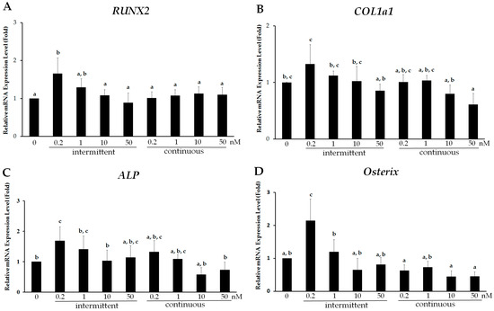 Intermittent administration of parathyroid hormone (PTH) (1–34) enhances osteogenesis in human mesenchymal stem cells (hMSCs). Relative mRNA expression of osteoblast-specific genes (A) RUNX2; (B) COL1a1; (C) ALP and (D) Osterix, assessed by real time quantitative PCR, from hMSCs on day 7 of osteogenic induction and after treatment with 0.2, 1, 10, and 50 nM PTH (1–34) using two modalities: intermittent: 2 h per day for 7 days and continuous: every 2 days for 7 days. Data are represented as mean ± SD (n = 4). Statistical data analysis was performed by performing one-way ANOVA with Tukey’s post-hoc tests. Different letters represent significant differences between groups; those with the same letters were not significant (p < 0.05).