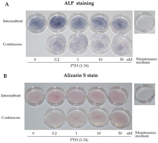 Our results showed that intermittent low-dose (0.2 nM) PTH (1–34) enhanced osteogenesis, compared to that with continuous and high dose treatment (Figure 1). High concentrations of PTH (1–34) did not efficiently promote hMSC osteogenic differentiation compared to that with low doses. This suggests that PTH (1–34) does not have a dose-dependent effect on osteogenic differentiation, and that higher PTH concentrations might even reduce bone differentiation. In addition, intermittent was shown to be far better than continuous administration. These results are in agreement with reports of others [30,31]. However, these studies used different PTH (1–34) doses; thus, the selection of dose might vary depending on source and stem cell type.