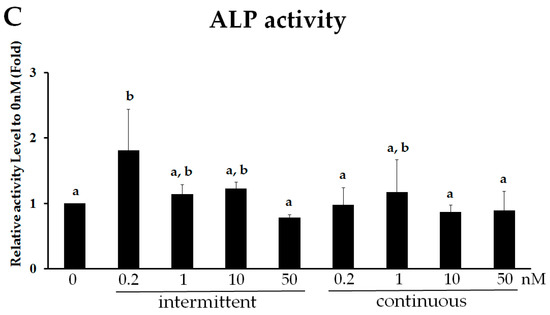 Intermittent parathyroid hormone (PTH) (1–34) treatment increased osteoblast activity during osteogenic differentiation of human mesenchymal stem cells (hMSCs). (A) Alkaline phosphatase (ALP) staining of hMSCs at day 7 of osteogenic induction and after treatment with 0.2, 1, 10, and 50 nM PTH (1–34) using two modalities: intermittent: 2 h per day for 7 days; and continuous: every 2 days for 7 days. Cells with ALP activity stained blue; (B) Alizarin Red staining for mineralized deposits in hMSCs at day 7 of osteogenic differentiation and after intermittent and continuous treatment with various concentrations (nM) of PTH (1–34); (C) Relative ALP activity in hMSCs at day 7 of osteogenic differentiation and after intermittent and continuous treatment with various concentrations (nM) of PTH (1–34). The relative activity in the samples was determined and compared to that of the no PTH (1–34) treatment control group and normalized to the total protein concentration (units/mg). Data are represented as mean ± SD (n = 3). Statistical data analysis was performed by performing one-way ANOVA with Tukey’s post-hoc tests. Different letters represent significant differences between groups; those with the same letters were not significant (p < 0.05).