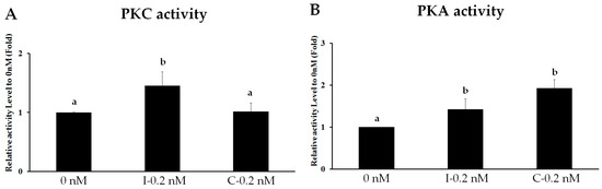 PKC pathway is activated by intermittent PTH (1–34). Protein kinase activity of PKC (A) and PKA (B) in human mesenchymal stem cells at day 7 of osteogenic differentiation after intermittent (I-0.2 nM) treatment for 2 h per day for 7 days or continuous (C-0.2 nM) treatment for 2 days for 7 days with 0.2 nM PTH (1–34). Relative kinase activity was normalized to the concentration of crude protein and compared to that in the 0-nM group. Data are represented as mean ± SD (n = 3). Statistical data analysis was performed by performing one-way ANOVA with Tukey’s post-hoc tests. Different letters represent significant differences between groups; those with the same letters were not significant (p < 0.05).
