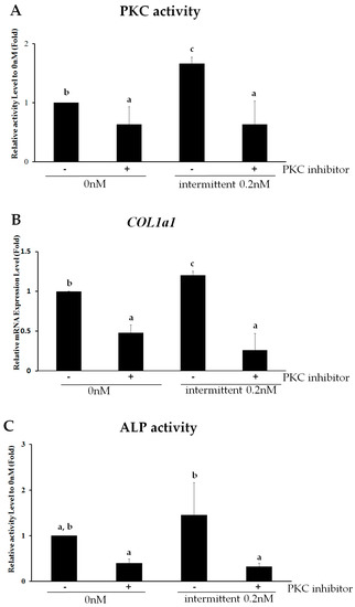 In Figure 3, intermittent PTH (1–34) treatment tended to increase PKC activity to a greater extent than continuous administration. Although continuous treatment also slightly increased PKC activity, PKA activity tended to increase with continuous treatment compared to that with intermittent treatment. Studies have shown that different concentrations of PTH (1–34) will differentially stimulate PKC and PKA activity; for example, low concentrations stimulate PKC translocation, but high concentrations strongly stimulate and favor PKA activity [40]. Prolonged PTH (1–34) exposure, for different durations, results in different degrees of PKC pathway stimulation [41]. Some studies have reported that PTH (1–34) exposure for 24 or 48 h results in the activation of the PKC pathway [42]. Therefore, PTH (1–34) activation, resulting in stimulation of either the PKC or PKA pathway, might be dependent on and influenced by PTH (1–34) treatment time, dose, absorption, and elimination or half-life. Our results have shown that intermittent 0.2 nM PTH (1–34) administration selectively activates the PKC pathway, more so than PKA.