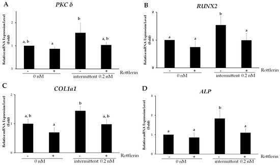 Since PKC signaling is involved in enhanced osteogenic differentiation mediated by intermittent PTH (1–34) treatment, we examined the role of specific PKC isoforms in osteogenesis. PKCα and PKCδ have been reported to be involved in osteogenesis from hMSCs [5,20,21]. We initially examined PKCδ and PKCα expression in differentiating hMSCs. Figure 5A shows that PKCδ was expressed in differentiating hMSCs; expression increased by 1.56-fold upon intermittent administration of 0.2 nM PTH (1–34). However, PKCα expression did not increase with treatment. To determine whether PKCδ specifically mediates enhanced osteogenesis with intermittent PTH (1–34) treatment, hMSCs were treated with the specific PKCδ inhibitor Rottlerin on day 7 of osteogenic induction. Expression of PKCδ declined to 1.03-fold (relative to control levels) upon treatment with Rottlerin (Figure 5A).