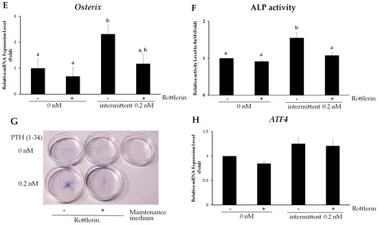 PKCδ mediates intermittent parathyroid hormone (PTH) (1–34)-enhanced osteogenesis in human mesenchymal stem cells (hMSCs). (A–E) Relative quantitative gene expression of (A) PKCδ; (B) RUNX2; (C) COL1a1; (D) ALP and (E) Osterix in hMSCs on day 7 of osteogenic differentiation after intermittent treatment with or without 0.2 nM of PTH (1–34) in the presence or absence of the specific PKCδ inhibitor Rottlerin. Data are presented as mean ± SD (n = 3). Different letters represent significant differences between groups (p < 0.05). (F,G) Functional assay for osteogenic differentiation after intermittent treatment with or without 0.2 nM of PTH (1–34) in the presence or absence of Rottlerin using hMSCs on day 7 of osteogenic induction. (F) Relative alkaline phosphatase (ALP) activity of the sample is reported as the ratio of ALP activity to the corresponding protein concentration (units/mg). Data are represented as mean ± SD (n = 3). Statistical data analysis was performed by performing one-way ANOVA with Tukey’s post-hoc tests. Different letters represent significant differences between groups; those with the same letters were not significant (p < 0.05); (G) ALP staining in hMSCs on day 7 of osteogenic induction and after intermittent treatment with 0.2 nM PTH (1–34) and Rottlerin; (H) Relative quantitative gene expression of ATF4 in hMSCs on day 7 of osteogenic differentiation after intermittent treatment with or without 0.2 nM of PTH (1–34) in the presence or absence of the specific PKCδ inhibitor Rottlerin.