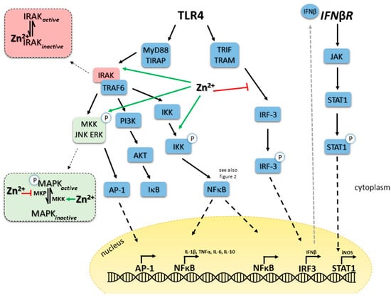 Zinc in TLR4 triggered signaling, illustrating explanations in the text. Black arrow: activation, green arrow: activating function of zinc, red T bar: inhibiting function of zinc, black dotted arrow, translocation of the molecule to nucleus, grey dotted arrow: secretion of the molecule. Abbreviations: ERK: extracellular Signal-regulated Kinase; IFN: interferon; IRAK: Interleukin-1 receptor-associated kinase; IκB: Inhibitor of NFκB; IKK: IκB kinase; IRF: interferon related factor; JAK: JNK janus kinase; JNK: c-Jun N-terminal Kinase; MAPK: mitogen activated protein kinases MEK: MAPK/Erk kinase; MKK: MAPK kinase; MKP: MAPK phosphatase; MyD88: Myeloid differentiation primary response gene 88; NFκB: nuclear factor (NF) κB. PI3K: phosphatidyl-inositol-3-phosphate; STAT: signal transducers and activators of transcription; TBK: Tank-binding kinase 1; TIRAP: toll-interleukin 1 receptor (TIR) domain containing adaptor protein; TLR: toll like receptor; TRAF: TNF receptor-associated factor; TRAM: TRIF-related adaptor molecule; TRIF: Toll-interleukin-1 receptor (TIR) domain-containing adaptor-inducing interferon.