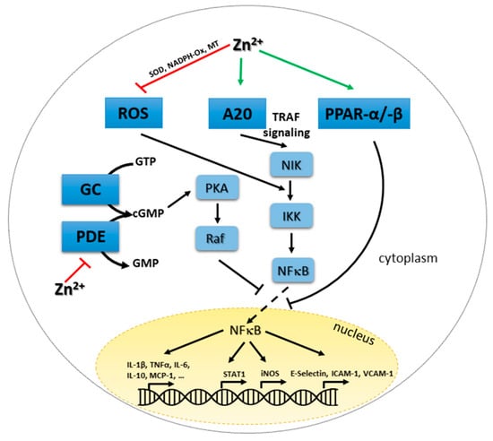 Complex impact of zinc on NFκB-centered signaling as illustration of signaling pathways described in the text. Red T bar: inhibitory function of zinc, green arrow: activating function of zinc, black T bar: inhibition, black arrow activation. Abbreviations: cGMP: cyclic guanine monophosphate; GC: guanine cyclase; GMP: guanine monophosphate; GTP: guanine triphosphate; ICAM: intercellular adhesion molecule; iNOS: inducible nitric oxide synthase; IKK: IκB kinase; IL: interleukin; MCP: monocyte chemoattractant protein; NIK: NFκB-inducing kinase; NFκB: nuclear factor (NF)κB; PDE: phosphodiesterase; PKA: protein kinase A; PPAR: Peroxisome proliferator-activated receptor; ROS: reactive oxygen species; STAT: Signal transducer and activator of transcription; TNF: tumor necrosis factor; VCAM: vascular cell adhesion molecule.