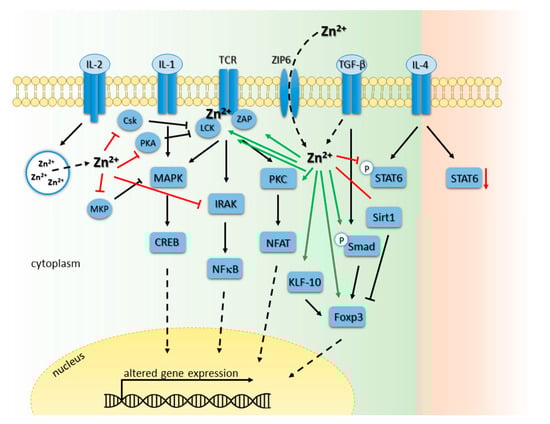 Influence of zinc signals on T cell signaling pathways. This figure presents an overview of T cell receptor (TCR)-, Interleukin-1 receptor (IL-1R)-, IL-2R-, IL-4R-, Transforming growth factor β1 receptor (TGF-β1R)-signaling in T cells, as well as zinc flux via zinc transporter ZIP6. Signaling pathways are described in detail in the text. Black arrow: activation, green arrow: activating function of zinc, red T bar: inhibiting function of zinc, black dotted arrow, translocation of the molecule to nucleus. Abbreviations: CREB: cyclic adenosine monophosphate response element-binding protein; Csk: c-src tyrosine kinase; Foxp3: forkhead-box-protein P3; IL: Interleukin; IRAK: interleukin-1 receptor-associated kinase; KLF-10: krüppel-like factor-10; Lck: lymphocyte-specific protein tyrosine kinase; MAPK: mitogen-activated protein kinase; MKP: MAP-kinase phosphatase; NFAT: nuclear factor of activated T cells; NFκB: nuclear factor kappa B; PKA: protein kinase A; PKC: protein kinase C; SIRT1: Sirtuin1; STAT: signal transducer and activator of transcription; TCR: T cell receptor; TGF-β1: transforming growth factor β1. ZAP: zeta-chain (TCR)-associated protein kinase.