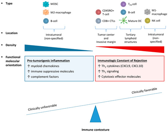 Attributes of an unfavorable versus favorable intratumoral immune contexture. The immune contexture of a tumor is defined by the combination of type, location and density of infiltrating immune cells and functional molecular orientation of the tumor microenvironment. A favorable immune contexture is defined by infiltrating CD45RO+ memory T cells, CD8+ cytotoxic T-lymphocytes (CTLs) to the tumor center and invasive margin and infiltration of follicular T-helper cells (TFH), B-cells and mature dendritic cells (DC) to tertiary lymphoid structures and infiltration of M1-macrophages and NK cells. A favorable functional molecular orientation is characterized by expression of immunologic constant of rejection (ICR) genes, including T-helper type 1 (Th1) cytokines (e.g., Chemokine (C-X-C motif) ligand 9 (CXCL9), and -10 (CXCL10)), Th1 signaling and cytotoxic effector molecules. An unfavorable immune contexture in terms of patient prognosis is characterized by intratumoral myeloid derived suppressor cells (MDSC), M2-macrophages and B-cells associated with pro-inflammatory gene expression, including myeloid chemokines, immune suppressive molecules and complement factors.