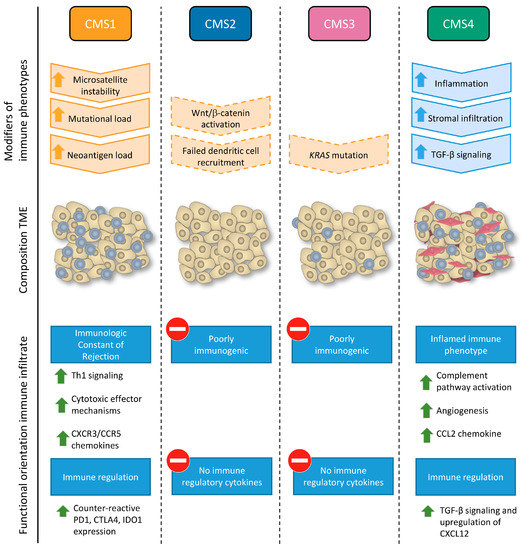 The analysis of the effects of the immune infiltrate in specific subgroups of patients, helps to determine factors that influence the effect immune cells have on clinical outcome of CRC patients. For example, in breast cancer, the prognostic value of an immune-based classification system is dependent on both the proliferation status and molecular subtype of the breast tumor [43]. For CRC, an international consortium of experts has recently introduced a gene expression-based classification system, defined as the “consensus molecular subtypes” (CMSs) of CRC, based on consensus between different previously stratification systems proposed by different research groups [50]. Briefly, four CMSs of CRC are recognized: CMS1 is characterized by MSI, mutations in the BRAF oncogene, a diffuse immune infiltrate, composed of Th1 cells and CTLs and a strong activation of immune evasion pathways; CMS2 tumors showed high chromosomal instability and activation of Wnt and MYC pathways; CMS3 displayed frequent KRAS mutations and disrupted metabolic pathways and CMS4 is characterized by high expression of mesenchymal genes, stromal infiltration, angiogenesis and transforming growth factor beta (TGF-β) activation (Figure 2). The four subtypes have differential prognosis, with CMS4 tumors displaying worse overall and relapse-free survival [50]. In a recent study, Becht et al. [18], demonstrated that the composition of the TME varies significantly between CMSs. Both CMS1 and CMS4 showed high levels of infiltrating CD8+ CTLs and CD68+ macrophages, as determined by the MCP-counter methodology. Stromal cell infiltration was significantly higher in CMS4 tumors compared with other CMSs. Gene expression analysis of chemokines, inflammatory molecules, immunoregulatory genes, MHC molecules, complement factors and angiogenesis demonstrated significant differences between CMS1 and CMS4, with CMS1 exhibiting a marked Th1 polarization, T cell attracting chemokines, and CMS4 showing high expression of complement components, myeloid chemokine chemokine (C-C motif) ligand 2 (CCL2), angiogenic factors and immunosuppressive molecules [18]. These findings illustrate that evaluation of the functional molecular orientation of the TME provides additional information beyond immune cell infiltration numbers.
