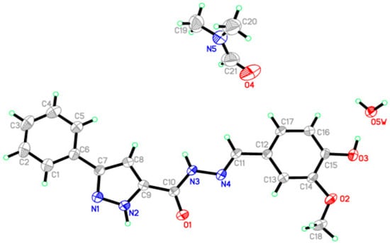 The selected bond lengths and bond angles and hydrogen bonds are listed in Tables S2–S5 in the Supplementary Materials. The asymmetric unit of L1 contains one independent molecule with DMF and water molecules as mixed crystallizing solvent, as shown in Figure 1. All the bind lengths and angles are in normal ranges. In the crystal wrap, molecules are connected via many classical and non-classical intermolecular hydrogen bonds (Table S3). Figure 2 shows the crystal structure of L2. In the crystal structure, the pyrazole ring (N1/N2/C7–C9) makes dihedral angles with the phenyl ring (C1–C6) and tolyl ring (C12–C17), at 23.39° and 36.16°, respectively. In the crystal wrap, molecules are linked via two classical intermolecular hydrogen bonds between N1—H1N1···O1i and N3—H1N3···N2ii, Symmetry codes: (i) x, −y+1, z+1/2; and (ii) −x+1, y, −z+3/2 (Table S5).