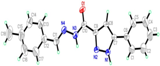- Karrouchi, K.; Ansar, M.; Radi, S.; Saadi, M.; El Ammari, L. Crystal structure of N′-diphenylmethylidene-5-methyl-1H-pyrazole-3-carbohydrazide. Acta Crystallogr. E Crystallogr. Commun. 2015, 71, o890–o891. [Google Scholar] [CrossRef] [PubMed]
