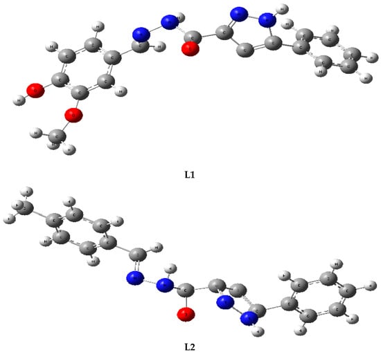 The computational studies of compounds L1 and L2 were performed at the B3LYP/6-31G level of theory using Gaussian 09 package programs [38,39]. The optimization geometries of L1 and L2 were performed using the Berny analytical gradient optimization method [40].