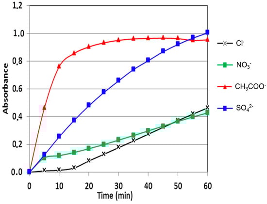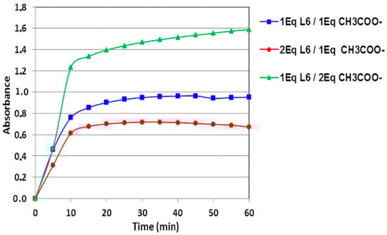 Basically, for any ligand used except L6, Cu(CH3COO)2 gives highest activities and CuCl2 gives lowest activities (Figure 6). Concerning CH3COO− and ligands L3, L4 and L6, the values of absorbance increase at the beginning of the reaction and then remain constant after a certain time. This has been explained in previous studies by a precipitation of the complex that can take place during this decrease in absorbance.