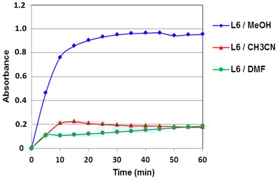 The effect of three solvents (MeOH, CH3CN and DMF) on the oxidation reaction with the ligand L6 and the Cu(CH3COO)2 salt is studied in similar thermodynamic conditions. The results of that study are presented by the rate values obtained for the oxidation reaction (Figure 8). Using a polar protic solvent such as methanol promotes oxidation reaction much better than the other two aprotic solvents, i.e., acetonitrile and DMF. Our results seem to be in perfect agreement with previous studies and show that solvatation of copper by the aprotic and polar solvents such as DMF and CH3CN decreases the catalytic activity of the metal cation in the oxidation reaction of catechol to o-quinone.