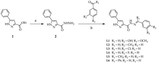 The synthetic routes of compounds L1–L6: (a) hydrazine hydrate (80%), ethanol, reflux 5h; and (b) ethanol, acetic acid, reflux, 2–5 h.
