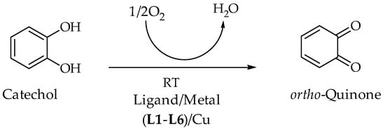 Catechol oxidation reaction catalyzed by copper complexes with ligands L1–L6 is followed by the evolution of o-quinone absorbance measured at 390 nm with a UV-vis spectrometer (Scheme 2).