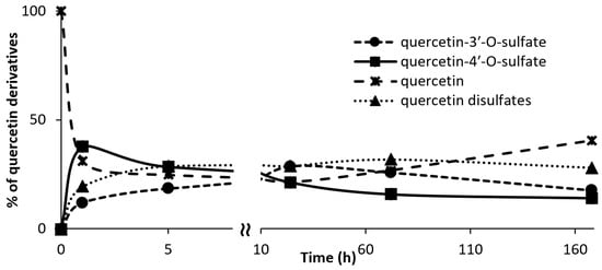 Quercetin sulfation vs. time. The percentage of soluble quercetin derivatives was calculated from the peak areas of the respective compounds. In the case of quercetin disulfates, the total percentage of all isomers was taken into the calculation.