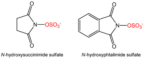 To manipulate the ratio of the sulfates formed we also tested alternative sulfate donors, namely N-hydroxysuccinimide sulfate, which was recently reported as a new sulfate donor for sulfation of resveratrol, estradiol, and bisphenol A [12], as well as N-phtalimide sulfate (Figure 2), which was specifically designed to improve aromatic interaction with AST or with the aromatic acceptor. The formation of quercetin sulfates was compared with all three sulfate donors, all at 1.2 equivalent. Although the ratio of monosulfates was slightly affected for N-hydrosuccimide sulfate, the overall conversion was rather low (67% at 5 h, Table 1) and almost no disulfates were formed. Using N-phtalimide sulfate, no sulfates of quercetin were detected at all. We therefore did not follow this approach and we studied in more detail the products of our previously optimized procedure [11].