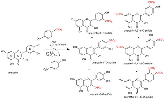 Quercetin (100 mg, 0.332 mmol, Sigma-Aldrich) was dissolved in 2.5 mL of acetone. p-Nitrophenyl sulfate (p-NPS, Sigma-Aldrich, 102 mg, 0.399 mmol, 1.2 eq.), AST from D. hafniense (360 U·mL−1 of the reaction mixture) and Tris-glycine buffer (to the final volume of 18 mL, 100 mM, pH 8.9) were added to the substrate solution and the mixture was incubated at 30 °C under argon atmosphere. The reaction progress was monitored by HPLC. The reaction was stopped after 1, 4, 24, 72, 168, and 336 h.