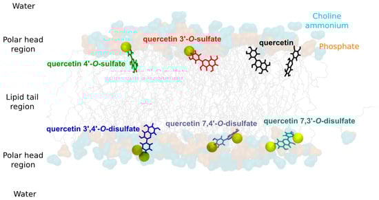 Representative snapshots of quercetin derivatives in 1-palmitoyl-2-oleoyl-sn-glycero-3-phosphocholine (POPC) membrane. Phosphate and choline ammonium moieties are depicted in orange and cyan, respectively. Sulfate moieties of each solute are pictured in yellow van der Waals radii.