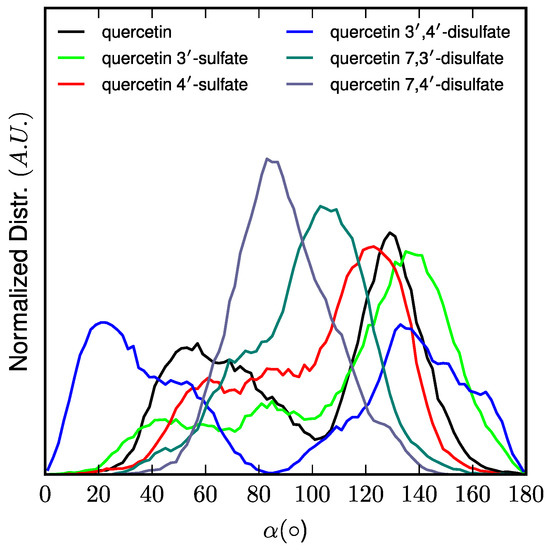 Interestingly, the location of the C-ring is strongly correlated to the orientation (followed by the α-angle, see Figure 5) of quercetin derivatives. The longest axis of quercetin-3′,4′-di-O-sulfate is parallel to the normal to the membrane surface (z-axis), the B-ring being strongly anchored to the lipid polar head region owing to the two sulfate moieties. In contrast, sulfate moieties of quercetin-7,3′-di-O-sulfate and quercetin-7,4′-di-O-sulfate are on the A- and B-rings maintaining the overall orientation perpendicular to the z-axis. Finally, B-rings of quercetin, quercetin-3′-O-sulfate, and quercetin-4′-O-sulfate mainly bind to the polar head region. However, such binding allows more flexibility than with disulfates, leading to a wider distribution of α-angle around 90° (Figure 5).