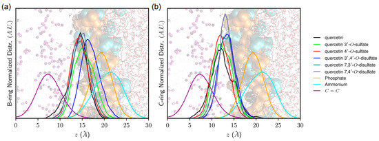 Normalized distribution of (a) B-ring and (b) C-ring of quercetin derivatives with respect to membrane normal axis (z). Background picture represents water-lipid bilayer interface, highlighting (from left to right) water phase, polar head charged moieties (choline and phosphate moieties depicted in blue and orange, respectively) as well as lipid leaflet region in which POPC C=C double bonds are colored in purple.