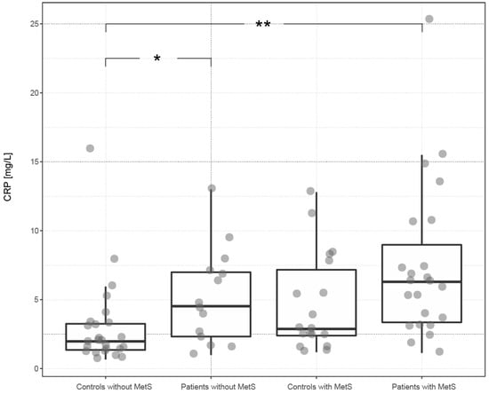 The distribution of CRP (C-reactive protein) among subgroups of subjects defined by the presence of psoriasis and metabolic syndrome. The box plot illustrates the distribution of CRP among subgroups of subjects defined by the presence of psoriasis and MetS (metabolic syndrome). Significant differences are depicted in the upper part of the plot, where * corresponds to p < 0.05 and ** to p < 0.01. For details, see Table 2. In the plot, the lower and upper hinges (first and third quartiles) surround the median of subgroup CRP distribution. The whiskers extend to the largest or smallest value no further than 1.5 times the distance between the first and third quartiles.