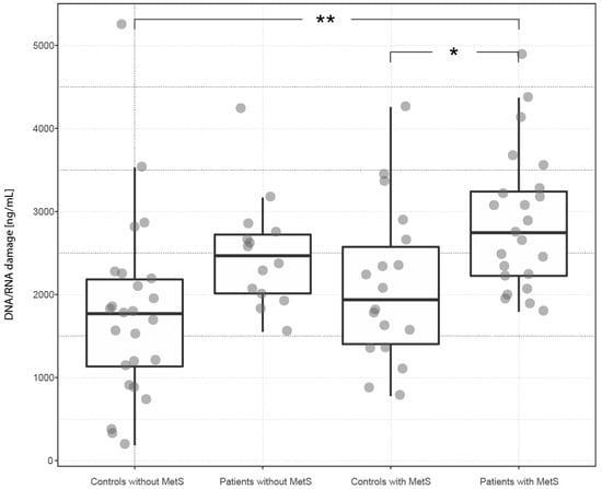 The distribution of DNA/RNA damage among subgroups of subjects defined by the presence of psoriasis and MetS. The box plot illustrates the distribution of DNA/RNA damage among subgroups of subjects defined by the presence of psoriasis and MetS. The plot arrangement corresponds to Figure 1.