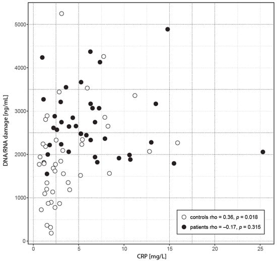 In the attempt to evaluate relationships between inflammation (CRP), DNA/RNA damage, and MetS, we performed correlation analyses. The results identified significant correlations between the PASI score and fasting glucose (rho = 0.38, p = 0.021). In exploring other parameters, we assessed, beside the relationship significance, whether the relationships are different between the groups. This was true for a positive correlation between DNA/RNA damage and CRP (rho = 0.36, p = 0.018) in the controls, which significantly differed (Fisher p = 0.0237) from the relationship found in the patients (rho = −0.17, p = 0.315) (Figure 3). We did not find such significant between-group difference for other significant correlations: age vs. CRP in patients (rho = 0.39, p = 0.016) and controls (rho = −0.024, p = 0.877)—Fisher p = 0.067; waist circumference vs. CRP in patients (rho = 0.36, p = 0.028) and controls (rho = 0.04, p = 0.821)—Fisher p = 0.157.