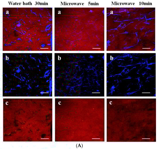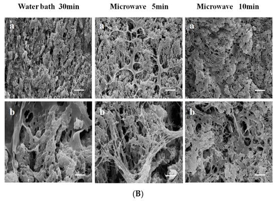 (A). CLSM images of glucomannan-protein mixed gels at room temperature (25 °C) after treated with different heating methods. (a) Microstructure (labeled protein and glucomannan) of glucomannan-protein mixed gels; (b) Microstructures (labeled glucomannan) of glucomannan-protein mixed gels; (c) Microstructures (labeled protein) of glucomannan-protein mixed gels. The scale bar indicates 20 μm; (B). SEM micrographs (1000× and 5000×) for glucomannan-protein mixed gels treated with different heating methods. (a) Microstructures (1000×) of glucomannan-protein mixed gels, the scale bar indicates 10 μm; (b) Microstructures (5000×) of glucomannan-protein mixed gels, the scale bar indicates 2 μm [19].
