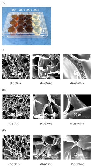 Digital photo of composite hydrogels with different GO loadings. (A) SEM images of the cross-section of the GO-0 hydrogel; (B) GO-3 hydrogel; (C) and GO-5 hydrogel; (D) at different magnifications [14].
