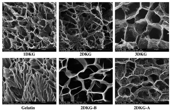 The microstructure of the freeze-dried oxidized KGM (DKG) composite gels, gelatin, and swollen state of 2DKG at pH 9.0 (2DKG-B) and at pH 4.0 (2DKG-A), the scale bar indicates 100 μm [44].