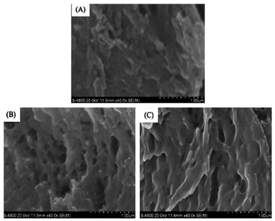 SEM photograph of cross-section of the semi-interpenetrating polymer network (IPN) hydrogels: (A) KP07; (B) KP08 and (C) KP09, the scale bar indicates 100 μm [52].