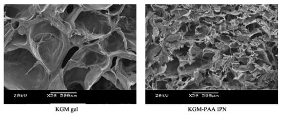 SEM pictures of the cross-section of the freeze-dried KGM hydrogel and KGM/PAA-IPN hydrogel. Magnification 50× [53].