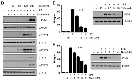 The expression of iNOS is regulated by multiple upstream signaling pathways, including MAPK, NF-κB, phosphatidylinositol 3-kinase (PI3K), STAT-1, and AP-1 [23,24,25]. To determine whether the MAPK, NF-κB, or PI3K pathways are involved in NO generation, we first assessed NO production after exposure to SB203580 (a p38 inhibitor), U0126 (an MAPK/extracellular signal-regulated kinase (ERK)1/2 inhibitor), SP600125 [a C-Jun N-terminal kinase (JNK) inhibitor], BAY 11-7085 (an NF-κB, IκBα inhibitor), and PI-103 (a PI3K inhibitor). NO generation was significantly attenuated by the p38, JNK, NF-κB, and PI3K inhibitors (~47%, ~22%, ~60%, and ~18%, respectively), whereas the inhibitor U0126 enhanced NO generation (Figure 4A). Unchanged MAPK phosphorylation, nuclear translocation of NF-κB p65 and phosphorylation of IκBα by Cl-amidine have been reported previously [18]. Here, we confirmed that Cl-amidine had no effect on the phosphorylation of MAPKs or NF-κB p65 (Figure 4B). Next, we examined whether Cl-amidine affects the DNA binding activity of NF-κB p65. Enhanced DNA binding activity of NF-κB p65 by LPS was not changed by Cl-amidine treatment (Figure 4C). Hypoxia-inducible factor-1α (HIF-1α) can stimulate iNOS expression, but its expression was also unchanged (Figure 4D). Interestingly, LPS-induced STAT1, STAT2, and STAT3 phosphorylation was decreased by Cl-amidine treatment for 2 h and/or 4 h (Figure 4D). Next, we confirmed that the JAK and STAT inhibitors effectively down-regulated iNOS expression. The JAK inhibitor tofacitinib and STAT inhibitor niclosamide dramatically decreased LPS-induced NO production and iNOS expression (Figure 4E,F). These results indicate that decreased STAT phosphorylation by Cl-amidine preferentially suppressed iNOS expression, resulting in reduced production of NO in DCs.