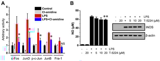 Next, we examined whether Cl-amidine can affect the activity of the AP-1 family, a candidate regulatory factor for iNOS expression. When AP-1 dimers are activated, they bind to a specific double-stranded DNA sequence containing the TPA-responsive element (5′-TGAGTCA-3′), and this AP-1 family activity also regulates iNOS expression [24]. Therefore, we examined whether Cl-amidine regulates LPS-induced activation of AP-1 using nuclear extract. As shown in Figure 5, the expression levels of the LPS-induced AP-1 family members (c-Fos, JunD, p-c-Jun, and JunB) were significantly decreased by Cl-amidine treatment.