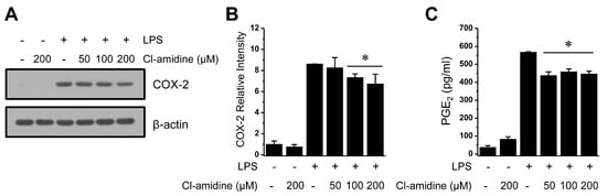 PGE2 is a major inflammatory mediator along with NO and is derived from cyclooxygenase 2 (COX-2). Inflammatory stimuli elicit the synthesis of iNOS and COX-2 proteins over similar time courses, and these two proteins also interact [26,27,28]. To investigate whether Cl-amidine affects COX-2 expression and PGE2 production, we measured COX-2 expression by Western blotting with an anti-COX-2 antibody and PGE2 levels using ELISA in LPS-stimulated DCs in the absence or presence of Cl-amidine. Expression of the COX-2 protein was down-regulated by ~20% in the presence of Cl-amidine treatment compared with the LPS alone treatment (Figure 6A,B), concomitant with a similar reduction in PGE2 formation (Figure 6C). This result indicates that Cl-amidine also exerts a mild effect on COX-2 induction and PGE2 production.