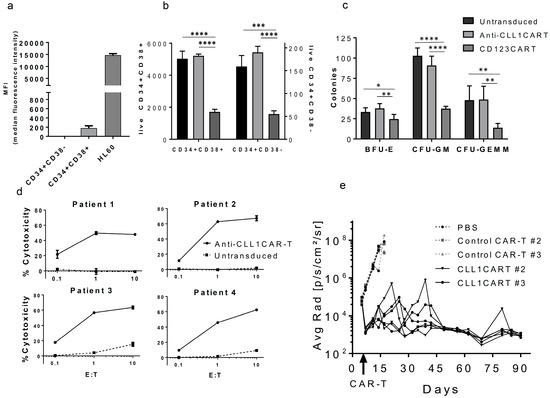 - Gill, S.; Tasian, S.K.; Ruella, M.; Shestova, O.; Li, Y.; Porter, D.L.; Carroll, M.; Danet-Desnoyers, G.; Scholler, J.; Grupp, S.A.; et al. Preclinical targeting of human acute myeloid leukemia and myeloablation using chimeric antigen receptor-modified T cells. Blood 2014, 123, 2343–2354. [Google Scholar] [CrossRef] [PubMed]