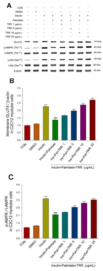 Skeletal muscle is the primary site of glucose uptake, disposal, and storage that accounts for approximately 75% of the entire body’s glucose uptake under insulin stimulation [38]. Insulin stimulates glucose uptake in skeletal muscle primarily by inducing net translocation of GLUT4 from the intracellular storage sites to the plasma membrane [10]. C2C12 myotube is known to be a useful model for analyzing GLUT4 translocation in skeletal muscle [39]. Thus, membrane of GLUT4 was chosen in C2C12 myotubes and skeletal muscle as the targeting to assess the antidiabetic mode of action of TRR. There are two pathways in relation to the promoted glucose uptake into skeletal muscle including the insulin-dependent mechanisms leading to Akt/protein kinase B (PKB) activation and contraction-regulated stimulation [40,41] or hypoxia-regulated AMPK activation [41,42]. Akt/PKB stimulates glucose uptake by modulating GLUT4 [43]. First, in vitro assay (Figure 2), TRR markedly increased expressions of p-Akt/t-Akt (at 10 and 25 μg/mL), and both of membrane GLUT4 and p-AMPK/t-AMPK (at 5, 10, and 25 μg/mL). We found that 5 μg/mL of TRR did not influence p-Akt but increased membrane GLUT4 expressions; moreover, 10 and 25 μg/mL of TRR may increase the expressions of p-Akt, p-AMPK, and GLUT4, suggesting that in palmitate-treated C2C12 myotube cells, TRR could stimulate convergent glucose transport activity, presuming possibly through insulin-dependent pathway or/and activation of AMPK.