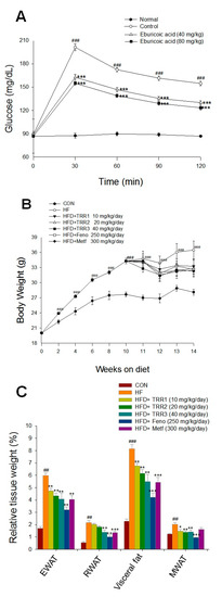 Effects of TRR including two parts. (A) Oral glucose tolerance (OGTT) was performed on 12 h fasted ICR mice (n = 5) that were allowed access to 40 and 80 mg/kg TRR or an equivalent amount of vehicle (water), which were given orally 30 min before an oral glucose load (1 g/kg body weight). The control group was given glucose, whereas the normal group was not. Blood samples were collected from the retro-orbital sinus of fasted mice at the time of the glucose administration (0) and every 30 until 120 min after glucose administration and the blood glucose level was monitored. Each point is the mean ± standard error (SE) of five separate mice. ### p < 0.001 compared with the control (CON) group; *** p < 0.001 were significantly different compared with the control group in the same time by ANOVA. (B–I) Effects of eburicoic acid (TRR) on (B) body weights, (C) relative tissue weight (%), (D) blood glucose levels, (E) blood triglycerides levels, (F) blood total cholesterol levels, (G) insulin levels, (H) leptin levels, and (I) adiponectin levels at week 14. Mice were fed with 45% high-fat diet (HFD) or low-fat diet (CON) for 14 weeks. After 14 weeks of induction, the HF mice were treated with vehicle, or eburicoic acid (TRR), or fenofibrate (Feno) or metformin (Metf) accompanied with HF diet for 4 weeks. All values are means ± SE (n = 9). ## p < 0.01, ### p < 0.001 compared with the control (CON) group; * p < 0.05, ** p < 0.01, and *** p < 0.001 compared with the high-fat-diet (HFD) plus vehicle (distilled water) (HF) group using ANOVA and with Dunnett’s tests. EWAT: Epididymal white adipose tissue; Feno: Fenofibrate (250 mg/kg body weight); Metf: Metformin (300 mg/kg body weight); MWAT: Mesenteric white adipose tissue; RWAT: Retroperioneal white adipose tissue; TRR1, TRR2, or TRR3: 10, 20, or 40 mg/kg body weight eburicoic acid, respectively; Visceral fat: EWAT + RWAT.