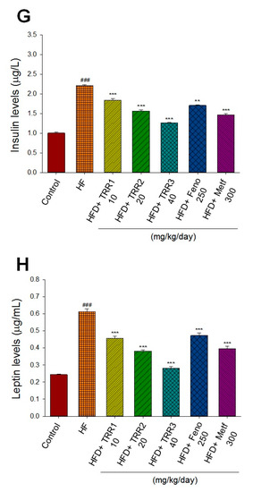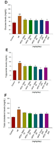 High-fat diet induction for 14 weeks displayed the significant hyperglycemia and hypertriglyceridemia (p < 0.001 and p < 0.001, respectively), and following treatment with TRR1, TRR2, TRR3, Feno, and Metf significantly lowered blood glucose and triglyceride levels as compared with the HF mice (Figure 3D,E). High-fat diet-induction for 14 weeks mice markedly increased blood total cholesterol levels (p < 0.001), and TRR2-, TRR3-, Feno-, and Metf-treated mice decreased blood total cholesterol (TC) levels as compared with the HF mice (Figure 3F). The HF mice displayed the significant hyperinsulinemia and hyperleptinemia (p < 0.001, p < 0.001, respectively), and TRR1-, TRR2-, TRR3-, Feno-, and Metf-treated mice significantly lowered levels of blood insulin and leptin (Figure 3G,H). The HF mice caused the hypoadiponemia (p < 0.001), and all of the TRR-, Feno-, and Metf-treated mice markedly increased adiponectin levels as compared with the HF mice (Figure 3I).