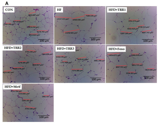 Histology of (A) epididymal white adipose tissue and (B) liver tissue of mice in the control (CON), high-fat-diet plus vehicle (distilled water) (HF), HFD + TRR1, HFD + TRR2, HFD + TRR3, HFD + fenofibrate (Feno), or HFD + metformin (Metf) groups by hematoxylin and eosin staining. Arrows indicated the hepatic ballooning degeneration. Each presented is typical and representative of nine mice, and one section per mouse. TRR1, TRR2, or TRR3: 10, 20, or 40 mg/kg body weight eburicoic acid, respectively Feno: Fenofibrate (250 mg/kg body weight); Metf: Metformin (300 mg/kg body weight).