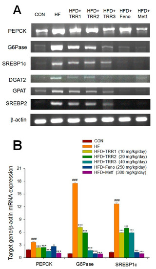 High-fat diet elicits increases in phosphenolpyruvate carboxykinase (PEPCK), glucose-6-phosphatase (G6Pase), acyl-coenzyme A:diacylglycerol acyltransferase 2 (DGAT 2), sterol regulatory element binding protein 1c (SREBP1c), glycerol-3-phosphate acyltransferase (GPAT), and sterol regulatory element-binding protein 2 (SREBP2) mRNA levels. The TRR1-, TRR2-, TRR3-, Feno-, or Metf-treated mice decreased mRNA levels of PEPCK, G6Pase, SREBP1c, DGAT2, GPAT, and SREBP2 (Figure 5).