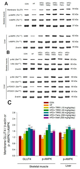 High-fat diet induced decreases in expression levels of membrane GLUT4 in skeletal muscles as compared with the CON group (p < 0.05). TRR1-, TRR2-, TRR3-, Feno-, or Metf-treated groups enhanced membrane GLUT4 expressions as compared with the HF group (Figure 6A). High-fat diet-induced mice decreased expression levels of p-AMPK/t-AMPK both in skeletal muscle and liver tissue (p < 0.05 and p < 0.001, respectively), which were significantly increased in TRR1-, TRR2-, TRR3-, Feno-, or Metf-treated groups as compared with the HF group (Figure 6A). High-fat diet-induced mice decreased expression levels of p-Akt/t-Akt both in skeletal muscle and liver tissue (p < 0.01 and p < 0.05, respectively), which were markedly enhanced in the TRR1-, TRR2-, TRR3-, Feno-, or Metf-treated mice (Figure 6B,C). High-fat diet-induced mice decreased expression levels of p-FOXO1/t-FOXO1 in liver tissue (p < 0.001), and were increased in the TRR1-, TRR2-, TRR3-, Feno-, or Metf-treated mice (Figure 6B,D).